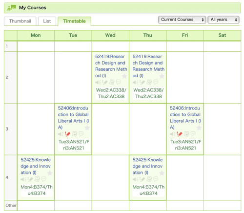 GLA's online portal Manaba showing the online courses for the second semester. Each 90-minute class is held twice a week, with one lecture and one tutorial.